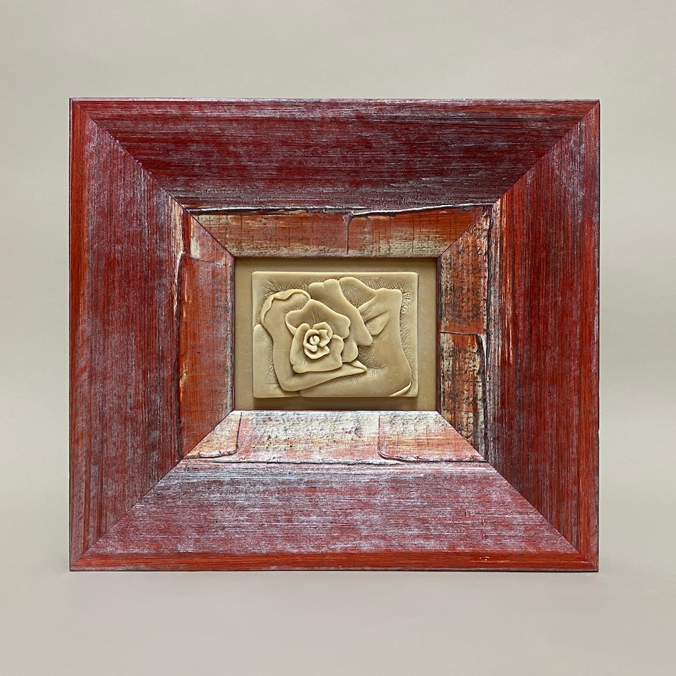 The rose symbolizes both love and woman and the white rose goes with motherhood. The petals are curled up and suggest an embryo, then a baby girl and a young lady and finally a pregnant woman.”