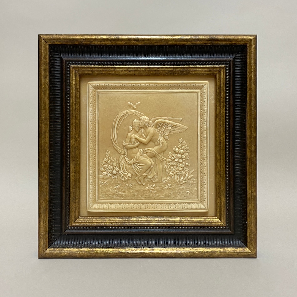 Inspiré de la peinture “Psyché recevant le premier baiser de l’Amour” de François Gérard, ce bas-relief illustre un moment suspendu entre amour et symbolisme. Psyché, princesse dont la beauté a éveillé la jalousie de Vénus, incarne l’âme humaine — un thème renforcé par le papillon posé au-dessus de sa tête, symbole de la psyché en grec.