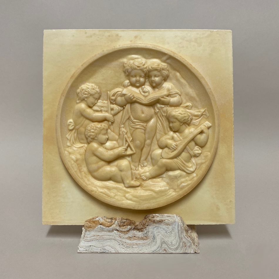 Ce bas-relief en calcaire illustre des anges musiciens dans une scène empreinte de spiritualité. La finesse des cristaux de calcite met en lumière ces figures célestes, chacune exprimant sa louange à travers la musique. Violon, triangle, lyre et partitions se mêlent pour créer une diversité sonore qui se traduit visuellement par une harmonie parfaite.