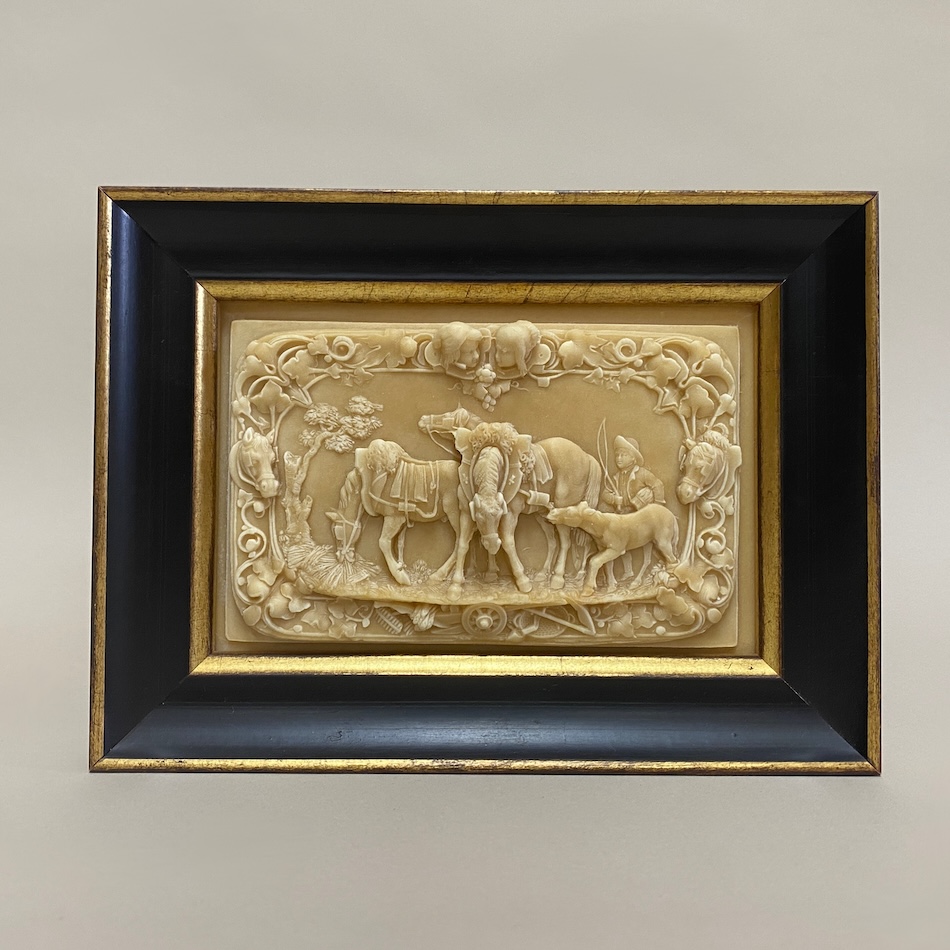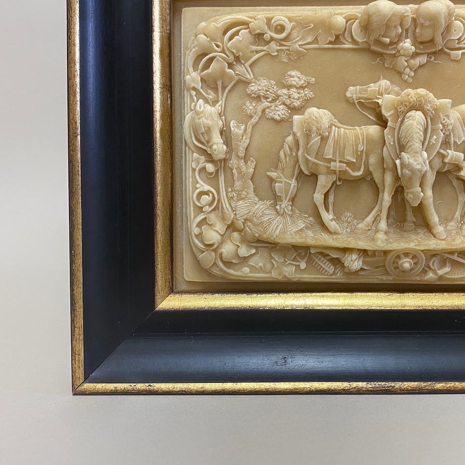 Véritable ode au monde équestre, ce bas-relief en calcaire réunit avec grâce un cheval harnaché et sellé, accompagné de son poulain, tandis que deux têtes chevalines émergent en encadrement de la composition. La scène centrale est ceinte d’une frise somptueuse, mêlant motifs champêtres et portraits des maîtres du domaine, un détail rare qui confère à cette œuvre une dimension intimiste et historique.