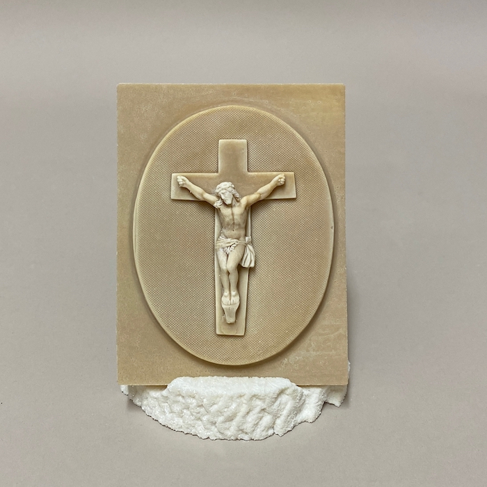 Ce bas-relief en calcaire capture la Crucifixion de Jésus-Christ avec un réalisme saisissant. Les détails du corps, le périzonium et le sigle INRI sont finement sculptés, tandis que l’arrière-plan travaillé met en valeur le relief central, créant profondeur et lumière. Une œuvre religieuse pleine de force et de précision.