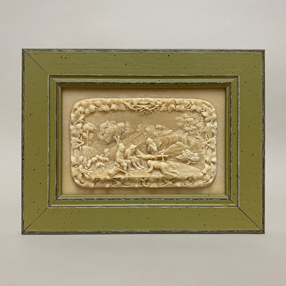 Ce bas-relief en calcaire représente une scène champêtre aux multiples détails. L’incrustation sur moulage est une technique permettant d’accompagner le dépôt calcaire lors de la reproduction de ces détails. Entourée d’une frise de feuilles délicatement nervurées, la scène est centrée sur des bergers faisant rôtir une bête à la broche sur un feu de bois. Un homme allongé à terre active le feu en soufflant dessus.
