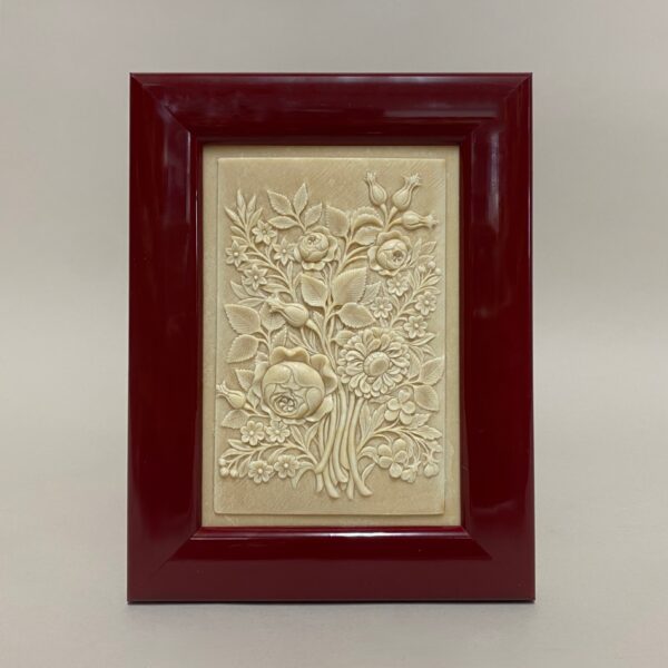 Création contemporaine et originale de l’artisan en pétrification, ce tableau se compose de 16 têtes de chiens (de 16 têtes de Saint-Hubert) issues d’une matrice en cuivre réalisée sous Napoléon III. La dernière tête de chien est meulée selon les contours du Saint-Hubert alors que les autres sont de forme rectangulaire. Cette présentation décalée permet de montrer l’unicité de chaque pièce : aucune n’est pareille, chacune diffère. L’ensemble est présenté dans un cadre baroque couleur acier. Il s’agit d’une création unique. On peut également voir un clin d’œil à Andy Warhol ?
