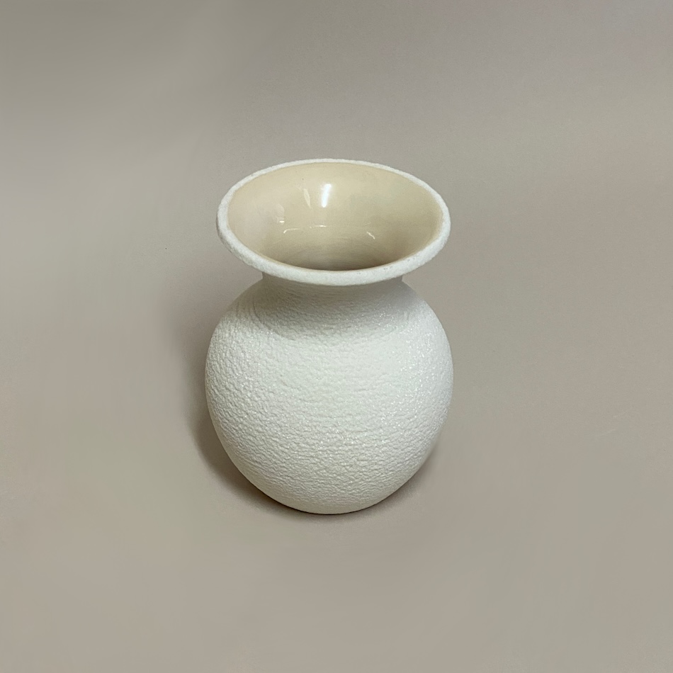 L’extérieur est brillant, presque pailleté et l’intérieur est émaillé, ici en blanc.
